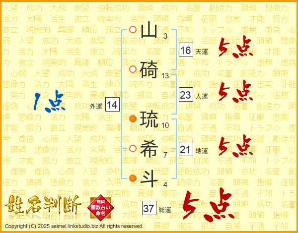 山(3画)碕(13画) 琉(10画)希(7画)斗(4画)