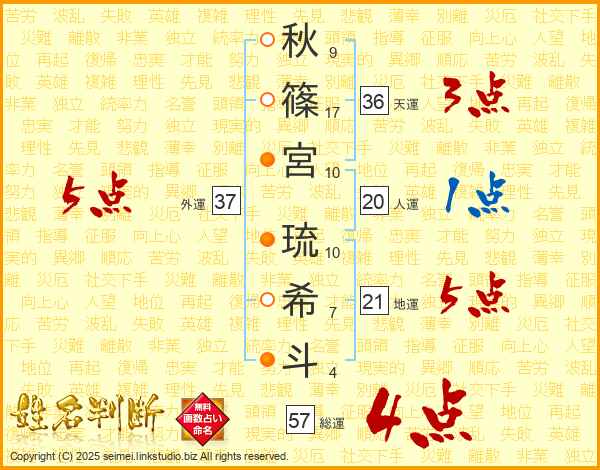 秋(9画)篠(17画)宮(10画) 琉(10画)希(7画)斗(4画)