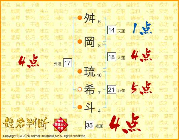 舛(6画)岡(8画) 琉(10画)希(7画)斗(4画)