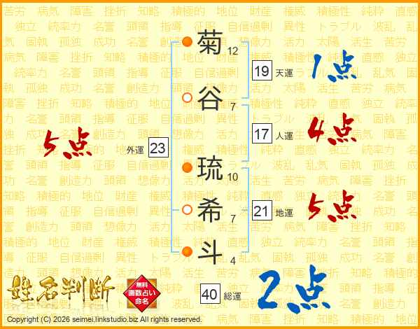 菊(12画)谷(7画) 琉(10画)希(7画)斗(4画)