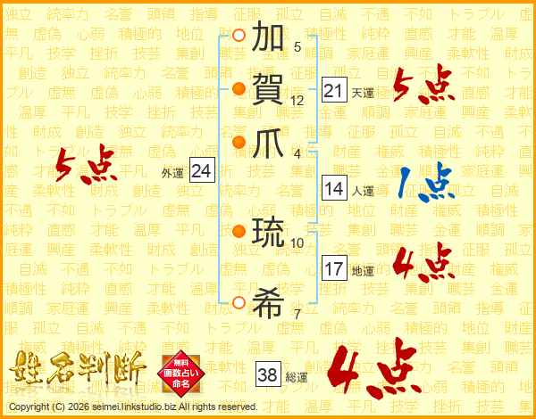 加(5画)賀(12画)爪(4画) 琉(10画)希(7画)