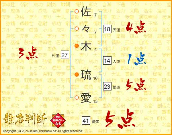 佐(7画)々(7画)木(4画) 琉(10画)愛(13画)