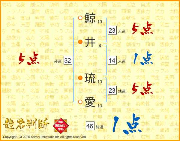 鯨(19画)井(4画) 琉(10画)愛(13画)