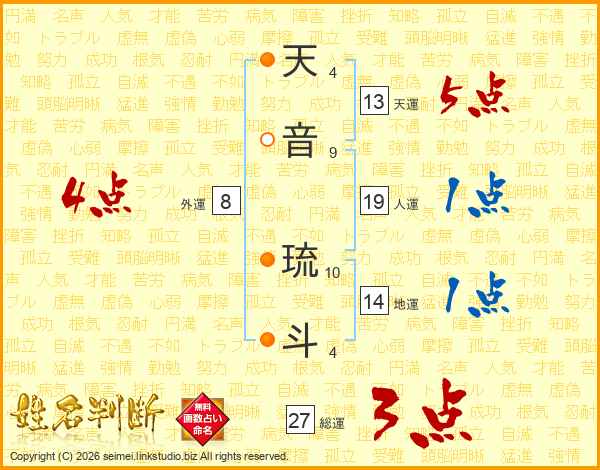 生活面を象徴する運勢です。外部から受ける影響力を表し、結婚運、家庭運や職場、環境への順応性を表します。総運から人運を引いた画数。姓や名が1文字の場合を除く。