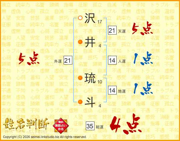 沢(17画)井(4画) 琉(10画)斗(4画)