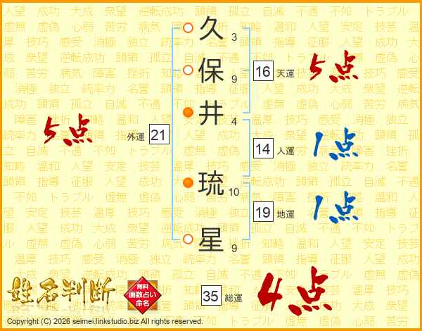 久(3画)保(9画)井(4画) 琉(10画)星(9画)