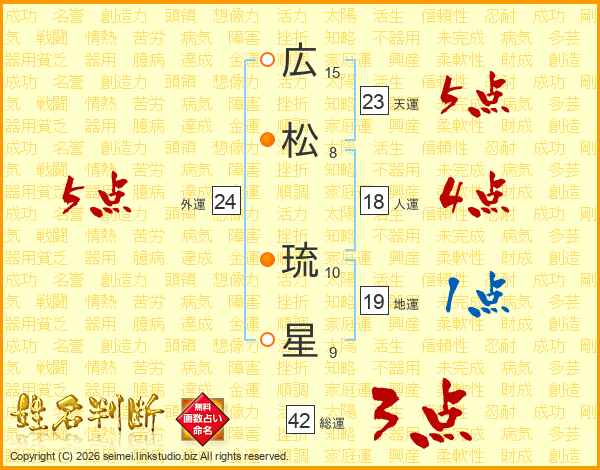 広(15画)松(8画) 琉(10画)星(9画)