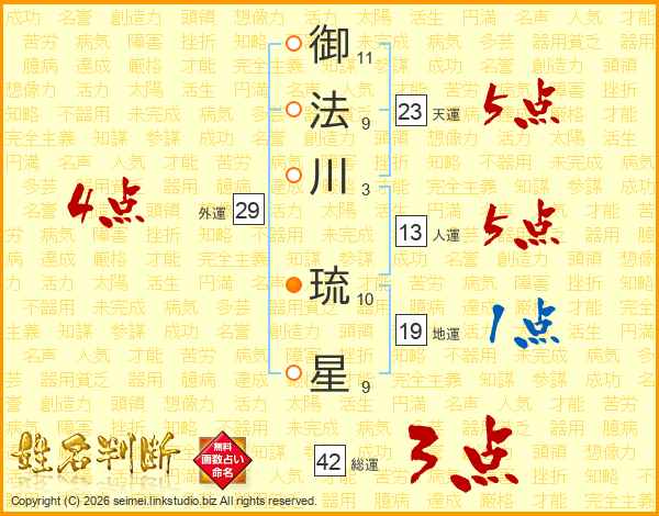 御(11画)法(9画)川(3画) 琉(10画)星(9画)