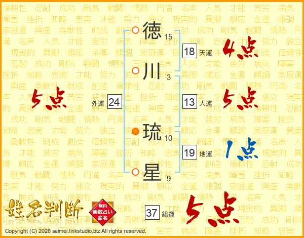 徳(15画)川(3画) 琉(10画)星(9画)