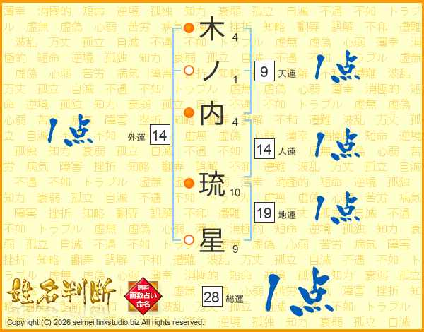 木(4画)ノ(1画)内(4画) 琉(10画)星(9画)