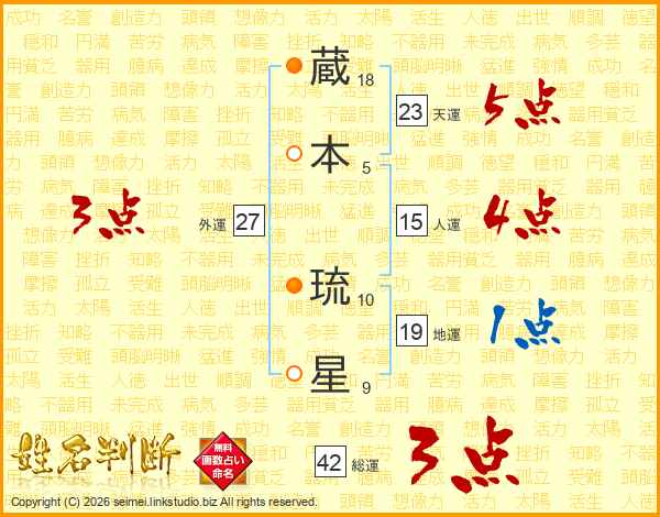 蔵(18画)本(5画) 琉(10画)星(9画)