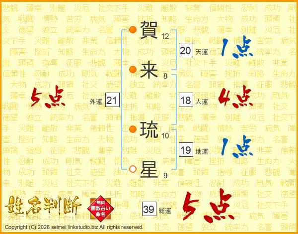 賀来琉星さんの総運は39画の5点!