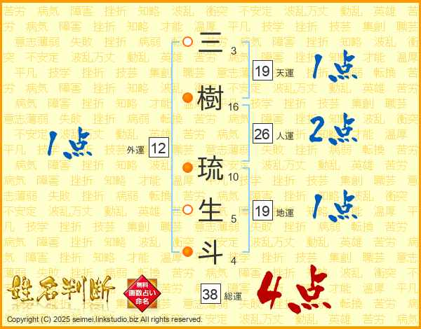 三(3画)樹(16画) 琉(10画)生(5画)斗(4画)