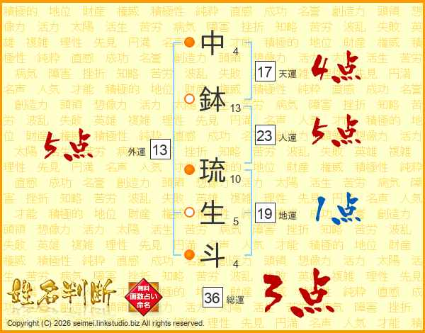 生活面を象徴する運勢です。外部から受ける影響力を表し、結婚運、家庭運や職場、環境への順応性を表します。総運から人運を引いた画数。姓や名が1文字の場合を除く。