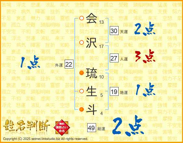 会(13画)沢(17画) 琉(10画)生(5画)斗(4画)