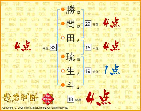 勝(12画)間(12画)田(5画) 琉(10画)生(5画)斗(4画)
