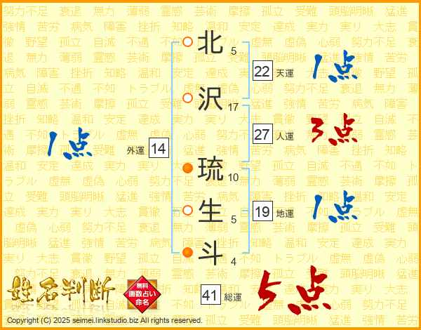 北(5画)沢(17画) 琉(10画)生(5画)斗(4画)