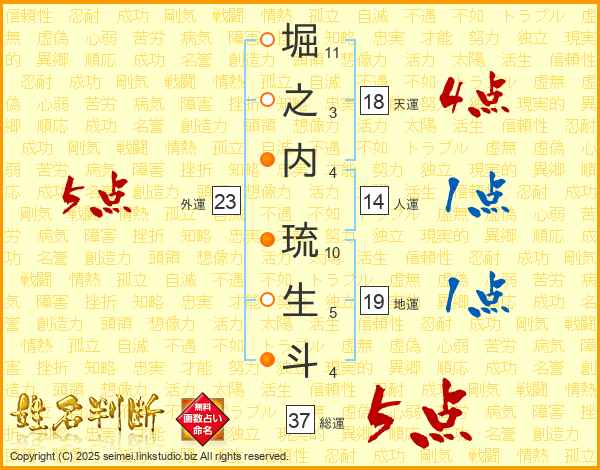 堀(11画)之(3画)内(4画) 琉(10画)生(5画)斗(4画)