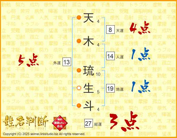 天(4画)木(4画) 琉(10画)生(5画)斗(4画)