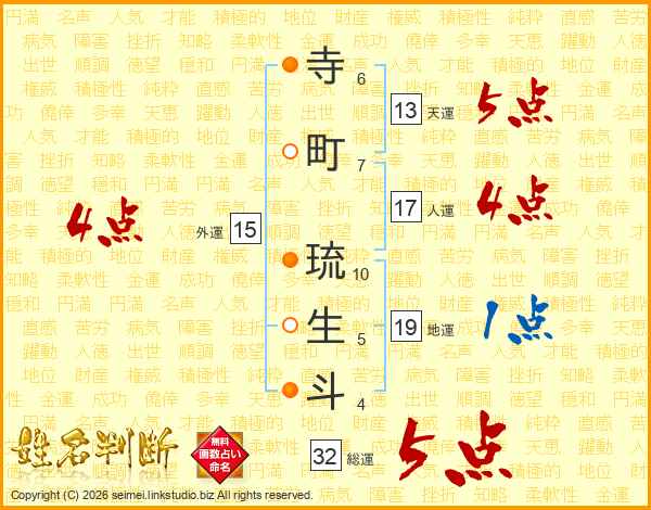 寺(6画)町(7画) 琉(10画)生(5画)斗(4画)