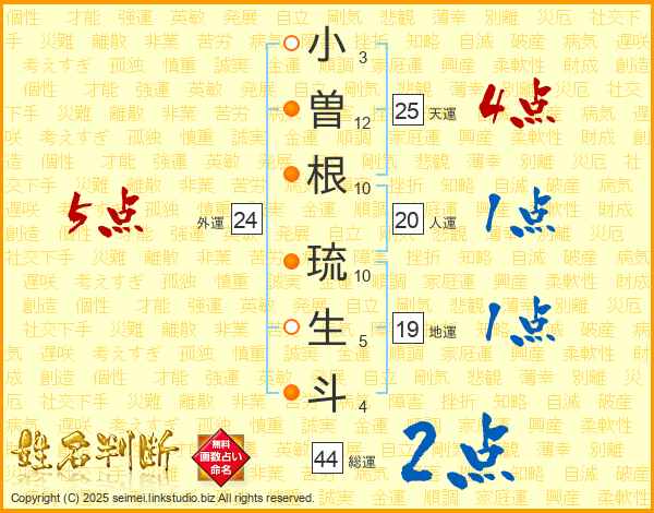 小(3画)曽(12画)根(10画) 琉(10画)生(5画)斗(4画)