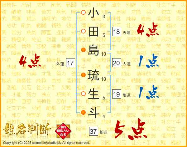 小(3画)田(5画)島(10画) 琉(10画)生(5画)斗(4画)