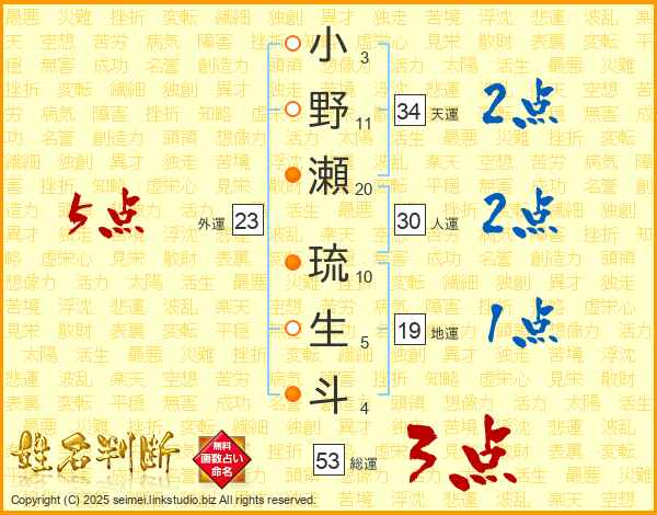 小(3画)野(11画)瀬(20画) 琉(10画)生(5画)斗(4画)