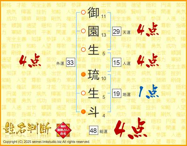 御(11画)園(13画)生(5画) 琉(10画)生(5画)斗(4画)