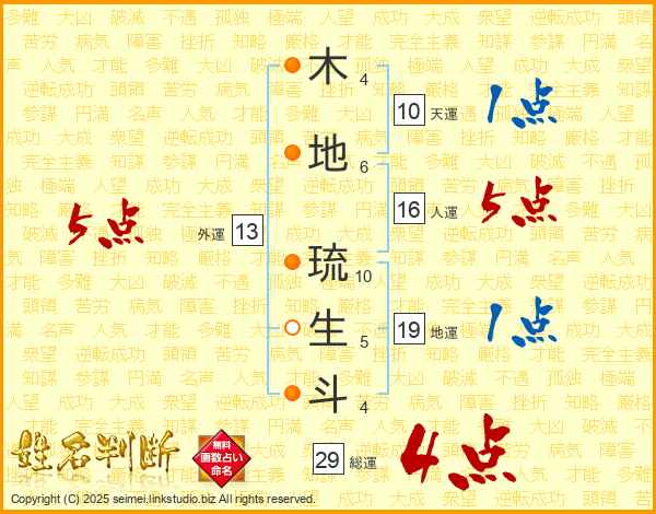 木(4画)地(6画) 琉(10画)生(5画)斗(4画)