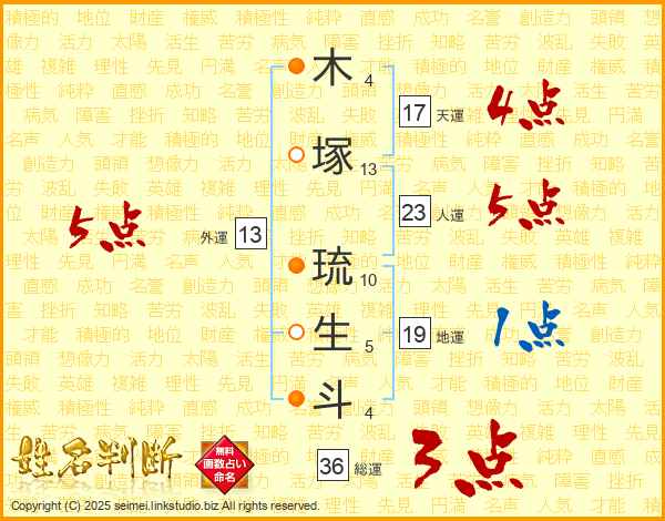 木(4画)塚(13画) 琉(10画)生(5画)斗(4画)