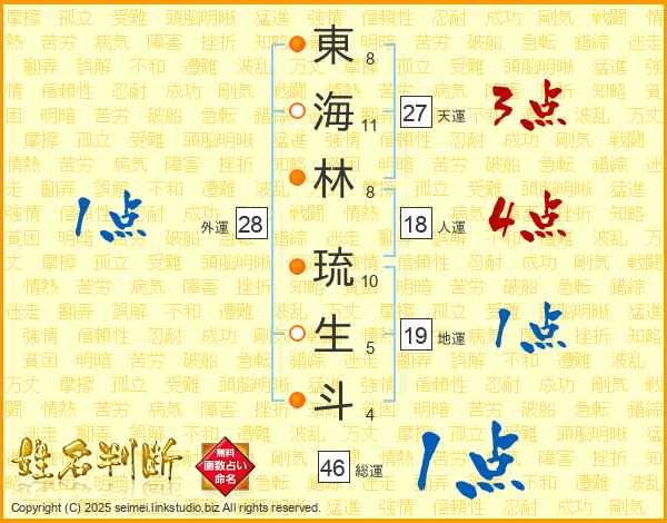 東(8画)海(11画)林(8画) 琉(10画)生(5画)斗(4画)