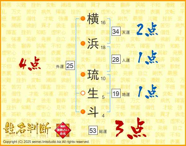 横(16画)浜(18画) 琉(10画)生(5画)斗(4画)