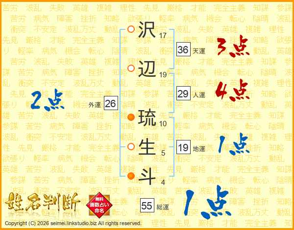 沢(17画)辺(19画) 琉(10画)生(5画)斗(4画)