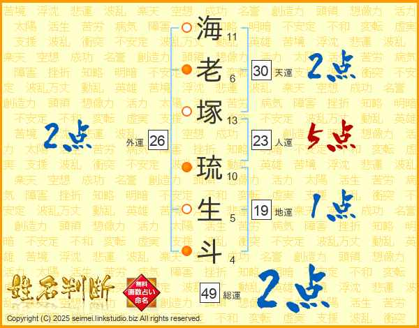 海(11画)老(6画)塚(13画) 琉(10画)生(5画)斗(4画)