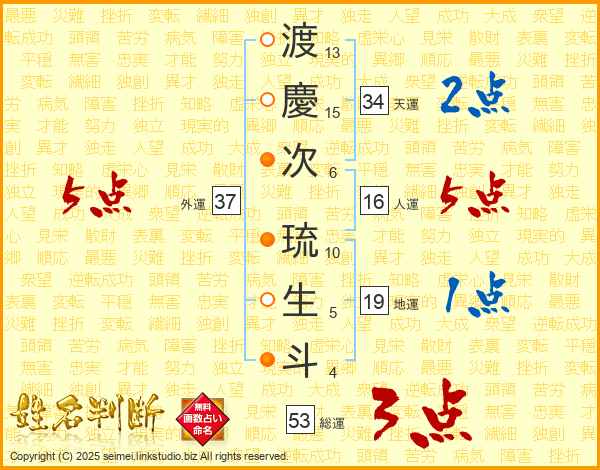 渡慶次琉生斗さんの外運は37画の5点!