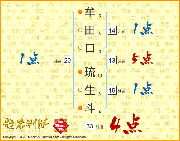 牟(6画)田(5画)口(3画) 琉(10画)生(5画)斗(4画)