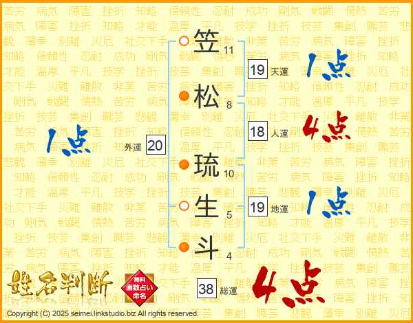 笠(11画)松(8画) 琉(10画)生(5画)斗(4画)