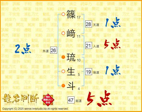 篠(17画)﨑(11画) 琉(10画)生(5画)斗(4画)