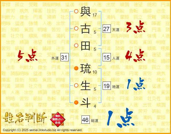 與(17画)古(5画)田(5画) 琉(10画)生(5画)斗(4画)