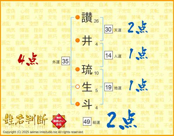 讃(26画)井(4画) 琉(10画)生(5画)斗(4画)