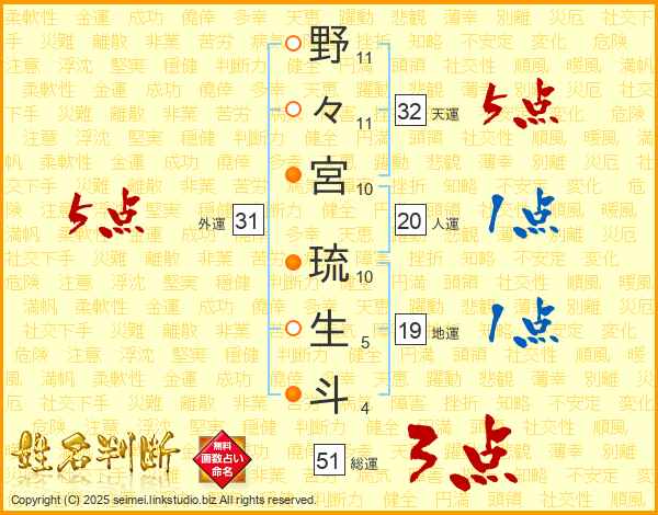 野(11画)々(11画)宮(10画) 琉(10画)生(5画)斗(4画)