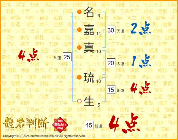 名(6画)嘉(14画)真(10画) 琉(10画)生(5画)