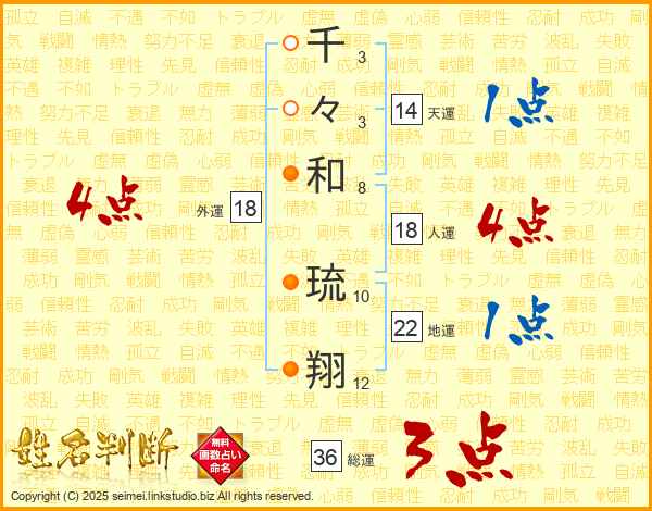 千(3画)々(3画)和(8画) 琉(10画)翔(12画)