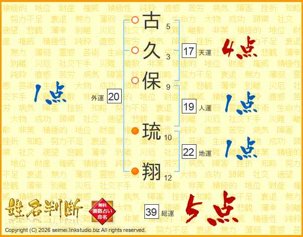 古(5画)久(3画)保(9画) 琉(10画)翔(12画)