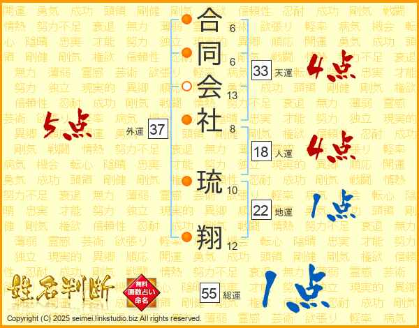 合(6画)同(6画)会(13画)社(8画) 琉(10画)翔(12画)