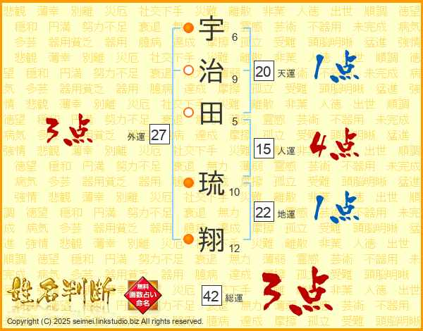 宇(6画)治(9画)田(5画) 琉(10画)翔(12画)