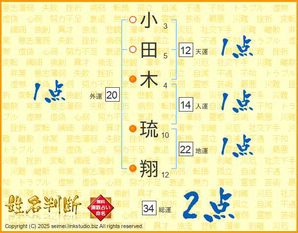 小(3画)田(5画)木(4画) 琉(10画)翔(12画)