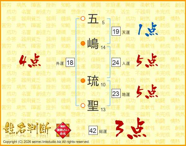 五(5画)嶋(14画) 琉(10画)聖(13画)