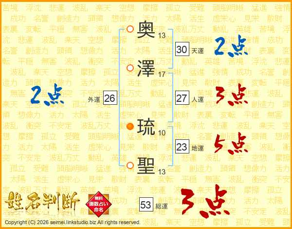 奥澤琉聖さんの総運は53画の3点!