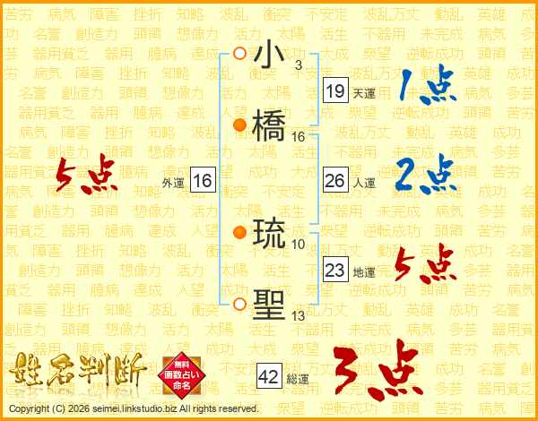 小(3画)橋(16画) 琉(10画)聖(13画)